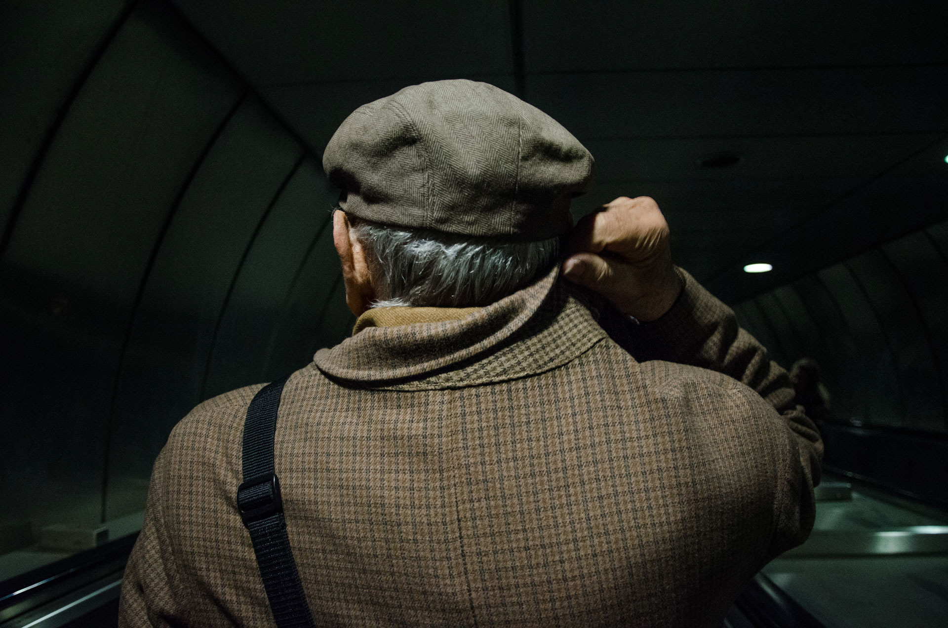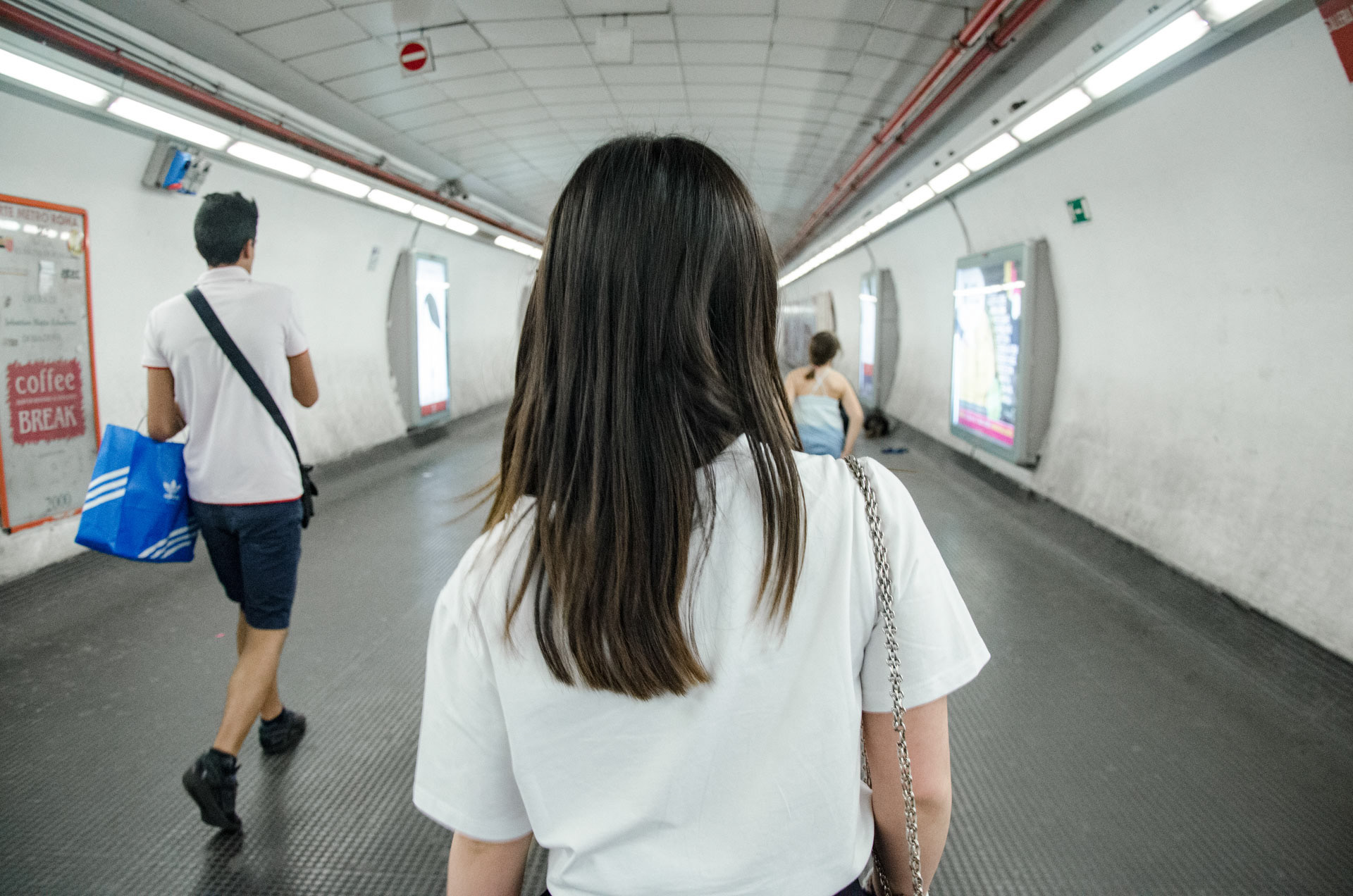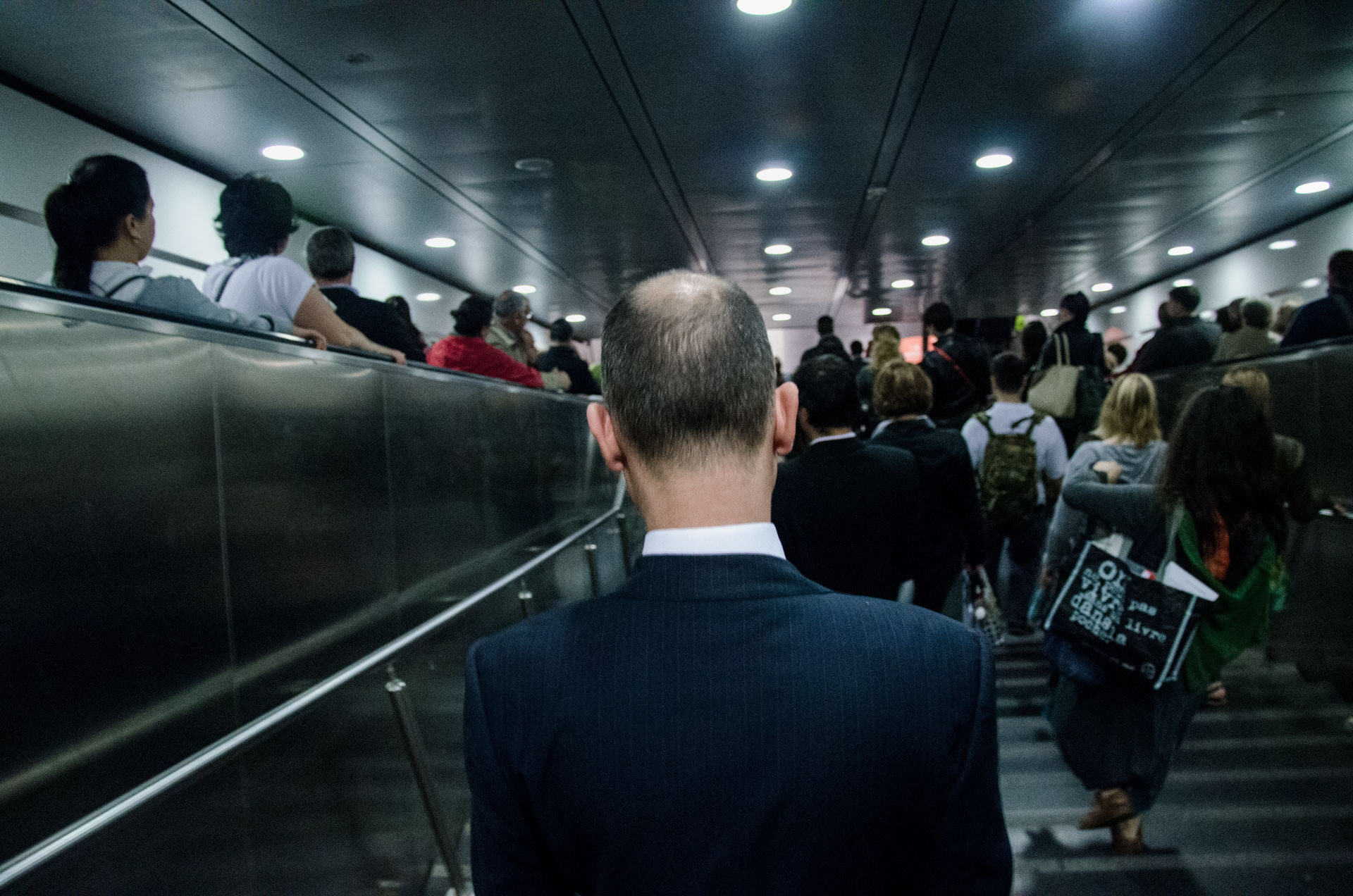 Tra il 2013 e il 2015 ho realizzato una serie di ritratti di spalle nelle metropolitane di Roma. L’idea è nata da un’osservazione quotidiana: prendevo la metro ogni giorno, più volte al giorno, e mi sono reso conto che nei percorsi obbligati delle stazioni, di fronte a sé si hanno solo persone di spalle. Dal tornello al vagone, si avanza sempre dietro qualcuno, condividendo lo stesso tragitto senza mai incrociarne lo sguardo. La stazione della metropolitana, paradigma del non-luogo, impone una direzione che genera una coreografia involontaria di corpi anonimi. Il progetto esplora il concetto di anonimato urbano e la distanza relazionale negli spazi metropolitani, restituendo una visione alternativa del ritratto, dove l’identità si gioca nell’assenza del volto.